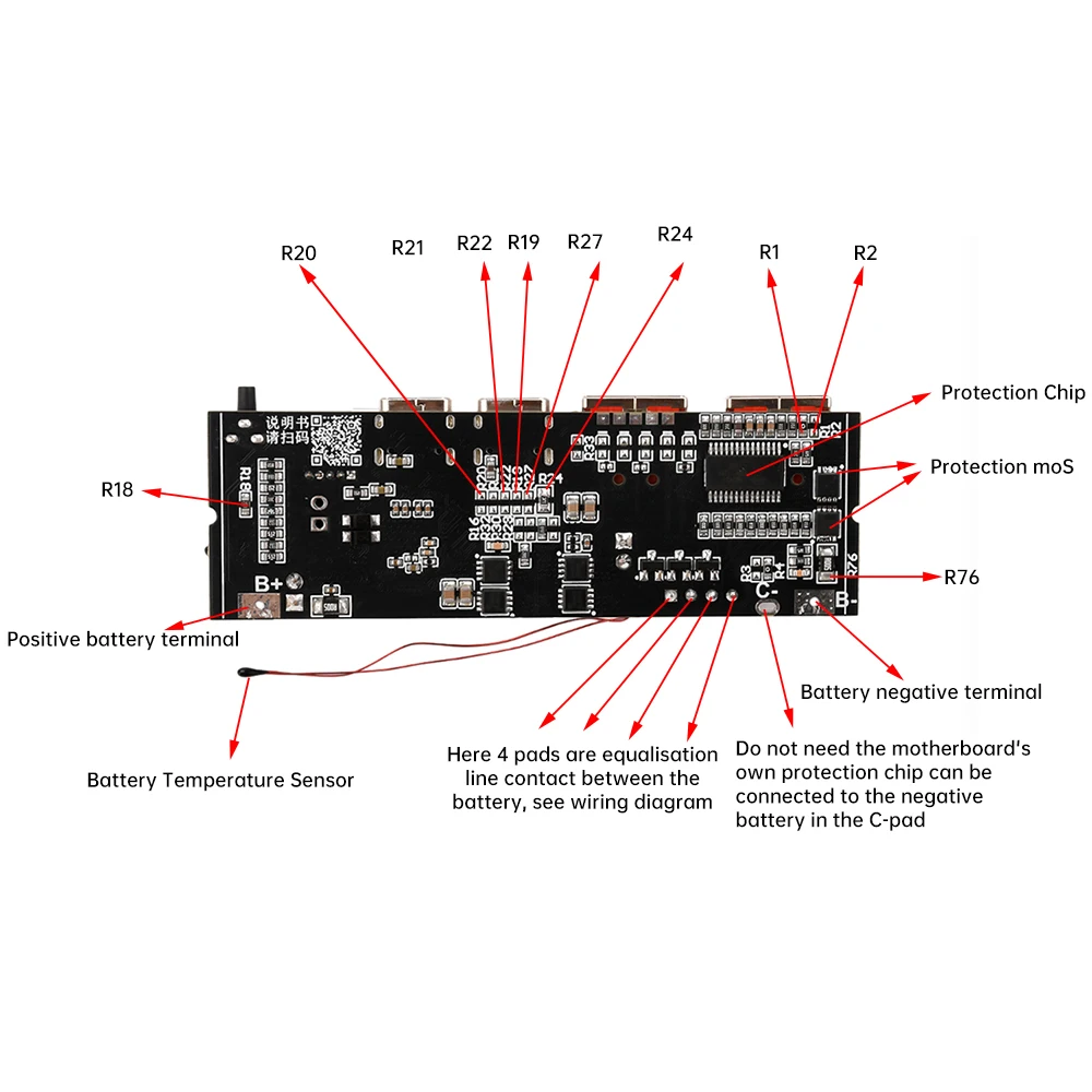 4. Температурний датчик: Приклейте комплектний датчик NTC до акумуляторів. При нагріванні вище 60°C плата вимкне зарядку.